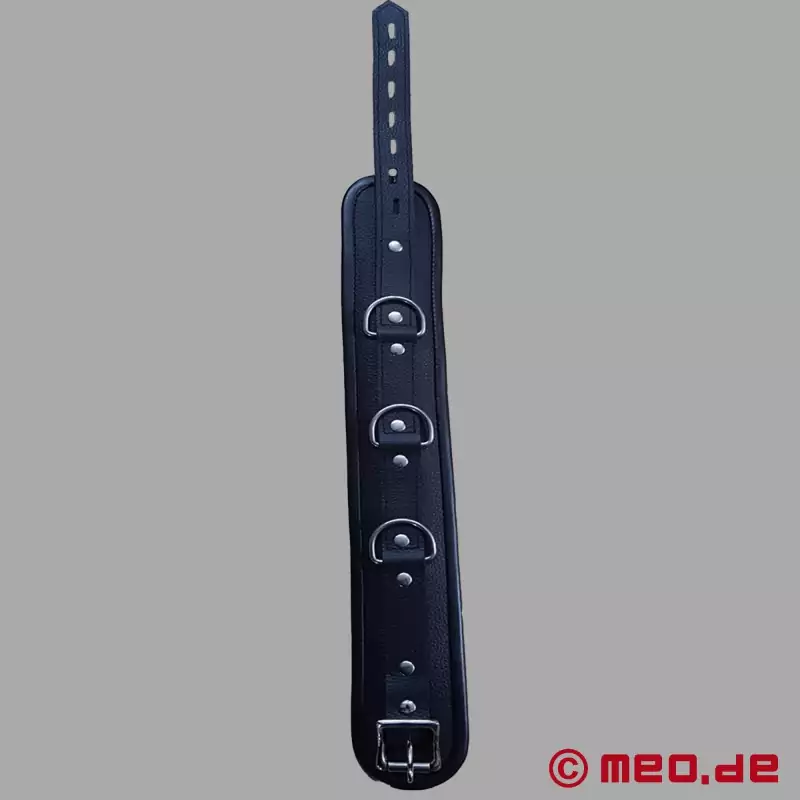Visiškai juoda BDSM apykaklė pagaminta iš tvirtos karvės odos ir turi 3 žiedus surišimo priedams tvirtinti. Paklusnusis partneris gali ilgiau dėvėti BDSM apykaklę neabejodamas ir mėgautis maksimaliu patogumu.