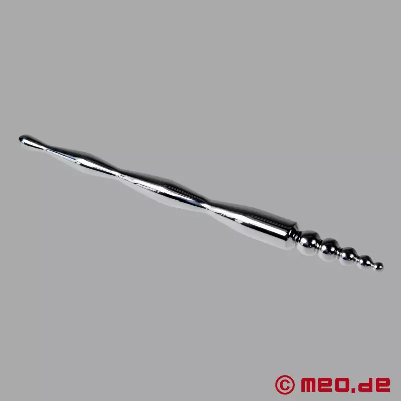 Cette sonde est un must, utilisée dans un sens (boules en premier) elle permet d'ouvrir l'urètre en douceur. Utilisée dans sa grande longueur, elle vient stimuler doucement la prostate au rythme de la masturbation. Je la laisse descendre doucement dans ma queue, quand les 15mm ont passé le resserrement du méat urinaire et que seules deux petites boules dépassent du gland je me branle doucement jusqu'à une éjaculation somptueuse.