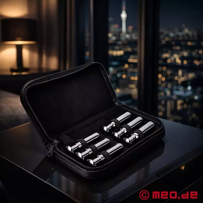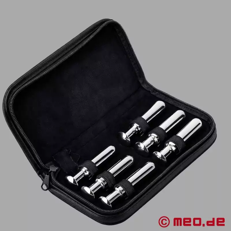 Pasirinkite nesibaigiantį malonumą su šiuo išsamiu dilatatorių rinkiniu. MEO® dilatatorių rinkinys pagamintas iš aukštos kokybės medicininio nerūdijančiojo plieno ir siūlo saugų bei higienišką būdą veiksmingai ištempti šlaplę su 6 skirtingų dydžių varpos kaiščiais. Visi dilatatoriai yra ergonomiškos formos ir užtikrina patogų naudojimą. Mūsų varpos kaiščiai turi vientisą užapvalintą galiuką, kad būtų lengva įkišti, ir grybo formos galvutę, kuri neleidžia jų įkišti per giliai. Mūsų varpos kaiščiai, žinoma, gali būti sterilizuojami. Rinkinys tiekiamas elegantiškame odiniame dėkle, kad būtų galima diskretiškai ir higieniškai laikyti.