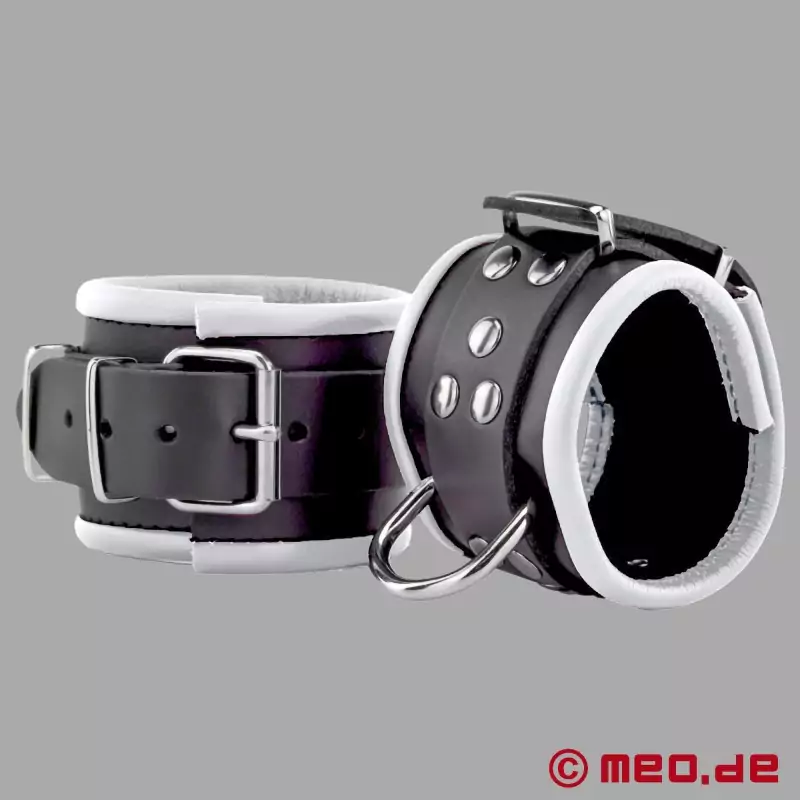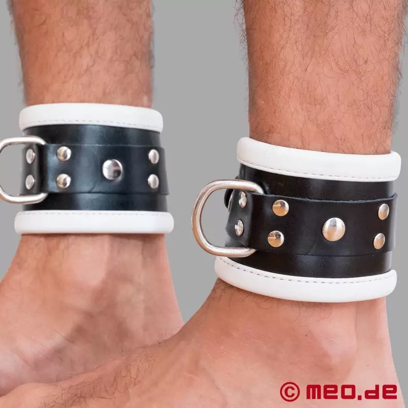 Mūsų juodos/baltos spalvos kulkšnies antrankiai yra aptraukti oda ir turi minkštą, suapvalintą ir susuktą apvadą, kuris eina palei tvirtos odinės juostelės kraštą. Tai garantuoja didelį patogumą BDSM sesijos metu ir ilgą šių puikių kulkšnies antrankių tarnavimo laiką.