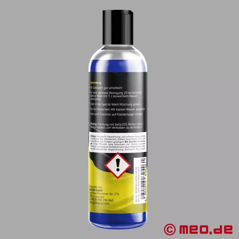 beGLOSS® Special Wash latex™ yra veganiškas ploviklis, kuris greitai, švelniai ir efektyviai valo latekso drabužius net ir žemoje temperatūroje. Jis pašalina riebalų ir alyvos likučius, neutralizuoja kvapus ir optimaliai paruošia latekso gaminius poliravimui ar sandėliavimui. Pagaminta Vokietijoje.