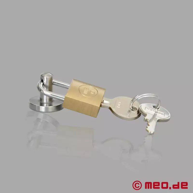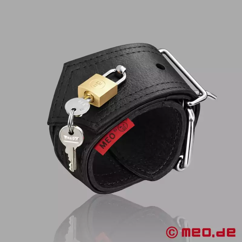The Locking Bolt & Padlock Combo secures your bondage straps with serious style - and no escape. Simply slide the bolt up through the first eyelet behind the buckle. Then thread the padlock through the top hole in the bolt. One click and the strap is locked. This system works seamlessly with most leather wrist and ankle restraints from MEO and beyond. Best of all? All locks are keyed alike - so one key unlocks them all. No confusion. No delays. Just pure, uncompromising control.