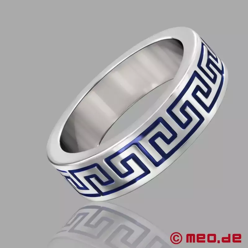 "La Greca" raštas yra vienas garsiausių senovės Graikijos ornamentų, kurį ir šiandien galima rasti architektūroje, mene ir dizaine. Jam būdinga susikertanti stačiakampė linijų juosta - galinga, geometriška ir nepavaldi laikui. Sidabrinės spalvos su mėlyna inkrustacija Cock Ring atrodo ypač švariai, kontrastingai ir prabangiai.